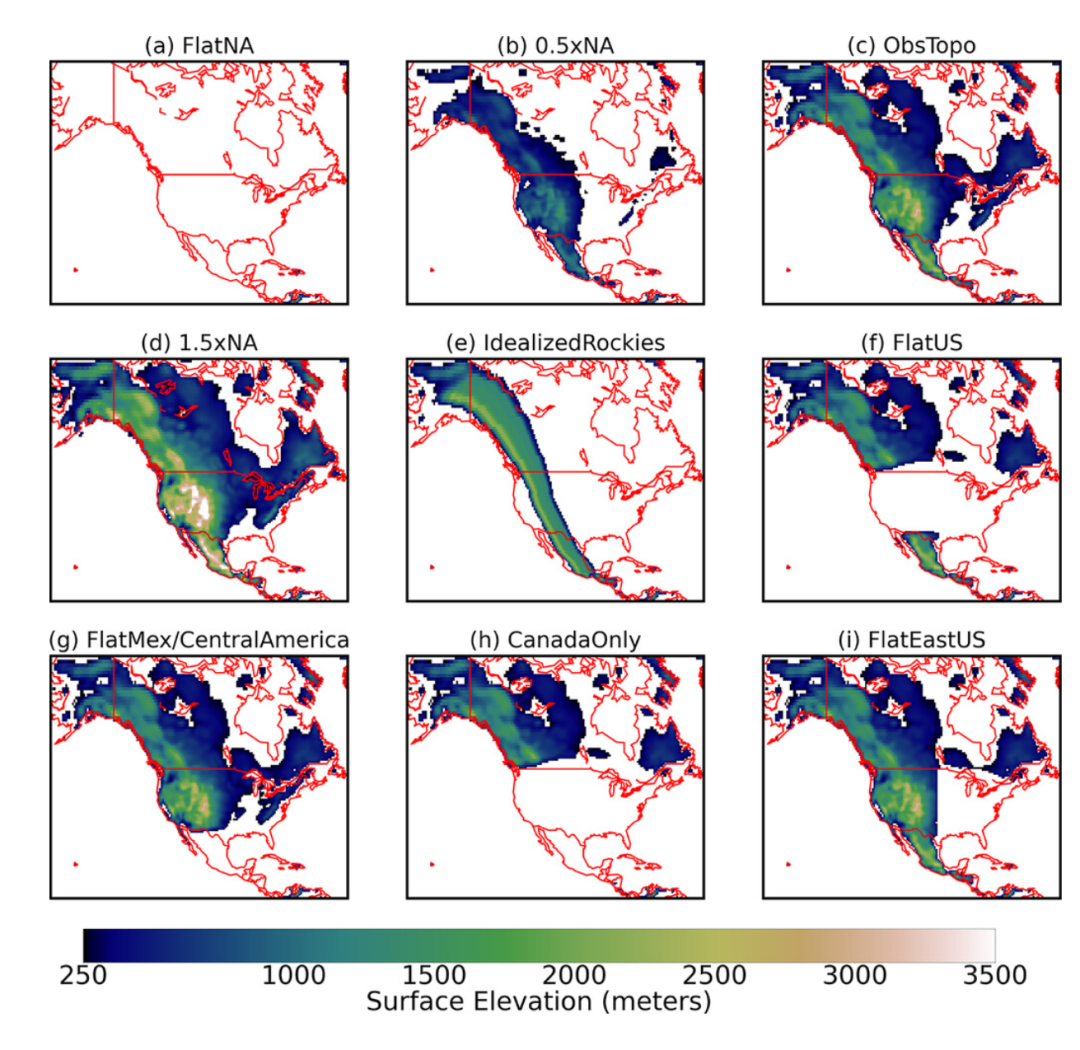 研究发现,北美西部的山脉使中纬度大尺度西风气流改道,导致了落基山脉北部的异常脊和从美国西南部延伸到北美东部和大西洋西北部的广泛的异常槽,对观测到的北美高振幅大气波型有重要贡献。墨西哥/中美洲山脉对副热带大尺度东风气流的阻塞和分流也对大尺度环流产生了重大影响,有助于北大西洋和太平洋副热带反气旋的实际分离。北美地形导致落基山脉西坡和中美洲东坡的降水强烈增强,其中大规模低空气流被迫上坡,北美内部干燥,美国东南部明显湿润,当实际地形结合在一起时,某些地区的降水增加超过100%。研究对地形实验进行了深入的动态分析,且表明北美地形的模拟影响如何与观测结果相一致。