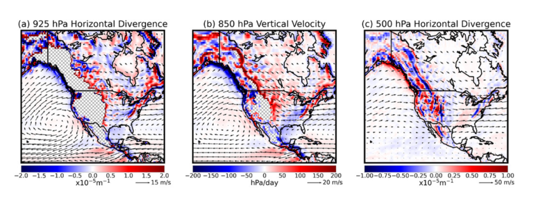 Fig. 8.December–March ObsTopo wind (vectors) and ObsTopo–FlatNA change in (a) horizontal divergence at 925 hPa, (b) vertical velocity at 850 hPa, and (c) horizontal divergence at 500 hPa.