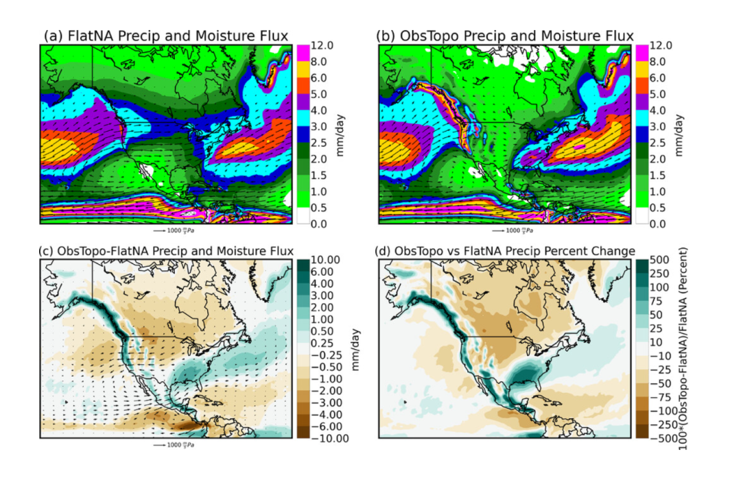 Fig. 15.December–March side-by-side panels of precipitation and vertically integrated moisture flux for (a) FlatNA and (b) ObsTopo. (c) ObsTopo–FlatNA change in precipitation and vertically integrated moisture flux and (d) percent change in precipitation.