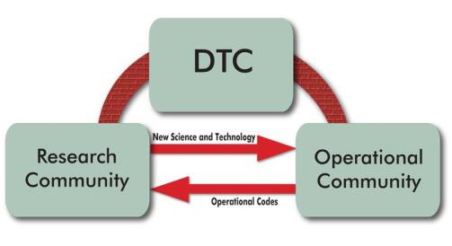 DTC(Developmental Testbed Center, 中试平台开发中心)是 NOAA 针对数值天气预报(NWP)的重要中试平台机构之一,DTC 提供各种设施,供NWP 研究团队验证和评估新模式和技术是否可以在研究和业务中应用。DTC 成功地将研究团队与业务团队结合起来,是中试平台发挥其既定效益的关键所在(上图)。