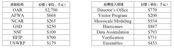 从 2013 财年各主办方经费支持(左表)和同期 DTC 经费分布(右表)来看, NOAA的海洋大气研究院(OAR)是 DTC 最大的投入方,也说明了数值天气预报业务应用在OAR 目标中的地位。虽然着重于基础研究的 NSF 作为主办机构之一投入不多,但其在数值天气预报研究界的号召力也是“无形”的支持。 DTC 内部分配较为平均,中尺度模拟和飓风是最大的投入方向。