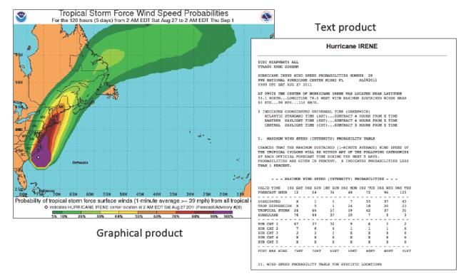 2001 年以来, JHT 支持了 74 个项目,其中 60 个项目完成,其中 39.5 个项目成果应用于业务,转化率较高; 6 个项目完成但被拒绝转化成业务; 9.5 个项目完成,但是否应用于业务在等待进一步研究(决策延期),其余 14 个项目在进行中。下图给出 JHT 项目成功业务化的例子: NHC 发布的飓风风速分布概率产品(图和文字, 下图)。