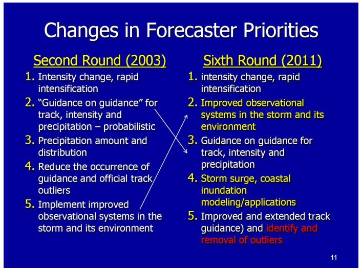JHT 的立项选题,是和 NHC 预报员关注的科学问题保持高度一致的。例如, 下页图给出了 JHT2003 年度和 2011 年度优先资助领域的分布,其中的变化(箭头)和增加(红色字)或修正(黄色字)的内容,就是来自预报一线。