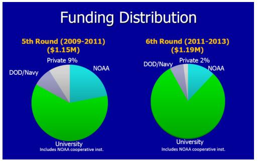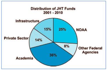 由于 JHT 成功的运作, 以及近年来飓风灾害在美国带来越来越大的影响,以改进飓风预报业务为主要目的 JHT 获得了更加广泛的支持。目前,其年度预算保持在 100 万美元以上(右上图)。 值得注意的是在这些预算中,真正来自 NOAA 的支持,与21 世纪前 10 年比较,其比例降低很多, 而来自美国大学的研究经费逐渐占据更大比例。 例如, 2001—2010 年NOAA 的经费占 1/4,来自学术界的经费为36%(右下图)。而目前学术界的经费在 80%左右。但是,在经费支持方面,来自私企的经费比例在明显减少。