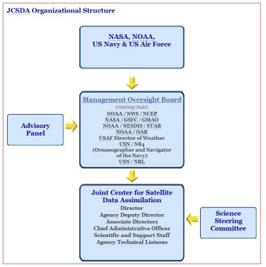 目前, JCSDA 的合作机构几乎包括了美国所有卫星资料同化机构(上图): NOAA 的NWS、 OAR 和 NESDIS; NASA 的 GSFC; 美国空军天气局(AFWA)和美国海军。 JCSDA 还接受定期独立评估,对其科技优先领域和战略发展方向给予指导。