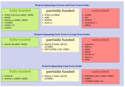 在 JCSDA 的近期和未来研究目标(右图)中,包括了几乎所有重要的气象卫星(其中, FY3 被列为尚未活动资助的目标),其科学敏感性的提前,可以在真正意义上引领气象业务的现代化。