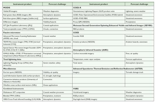 近年来, SPoRT 开发了大量针对不同卫星和传感器的业务应用产品(下表),这些产品在其网站实现了实时更新,供全球用户使用, 并且获得了很好的应用效果。 其中针对实时和高分辨率的 MODIS 图像开发的产品,对于预报员在短临预报应用中感知天气形势起到了重要作用 。SPoRT还和其他NOAA 中试平台合作,致力于预报问题研究和产品开发,已经开发并得到广泛应用的产品,例如,高分辨增强 MODIS/EOS 先进微波扫描辐射计(AMSR-E)海表温度(SST)合成产品、 NASA 陆地信息系统(LIS)陆地表明信息、 AIRS 大气探测信息等,都用于实时 WRF 确定预报。接近准实时的 LIS 数据和 SST 合成产品还进入 WRF 环境模拟系统,向预报员提供唯一的区域预报应用工具。 SPoRT 还与GOES-R 试验场一起,开发和转化 ABI( the Advanced Baseline Imagery)和 GLM(Geostationary Lightning Mapper)发射前的代用资料和产品, 为预报员利用新的观测资料做好准备。 在南方区域的 WFO,地面网的总闪观测被用来延长激烈天气警报的提前发布时间。 GOES-R 上的 GLM 也具备同样的观测能力, 因此,未来其很可能与地面监测网一起更好地改进激烈天气预警。目前, SPoRT 的所有数据,由预报员进行登记后,通过专门的 SPoRTblog 网站(weather.msfc.nasa.gov/sportblog)向全球发布。