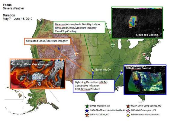 前面提到的 SPoRT 活动,有些是和 GOES-R 试验场合作完成的,而 GOES-R 试验场(GOES-R Proving Ground)本身,也是重要的中试平台之一。 GOES-R 试验场创建于 2008年,目的是让用户加快认识和利用计划在 2015 年发射的下一代美国静止环境卫星资料。GOES-R 试验场的概念,也是来自用户,最早是在 2004 年 GOES 用户大会上被提出,背景是 GOES-R 与当时的 GOES 相比,很多新的和先进的能力,需要提前向用户进行业务化前的展示。这里所说的用户,包括了 NWS 预报、监测和预警人员,以及相关部门用户。为了迎接未来新卫星的先进功能,各种用户需要在发射前很长时间,完成 AWIPS 向 AWIPS-II的过渡,才有可能第一时间享受 GOES-R 带来的业务能力提升。实际上 , 未来GOES-R能力的技术原型,或者说是展示平台已经通过当前卫星和陆地观测系统很好地仿真模拟(右图),换句话说,通过 GOES-R 试验场的工作 ,GOES-R卫星在其发射前数年,就已经被预报员用户所“熟知”,尽享其较目前 GOES 图像更高的空间、谱和时间分辨率;还能够通过实际上来自 WRF 等模式的合成云图和水汽图像,感受未来更加“真切”的图像产品。 下图是 2012年展示试验现场示意图。