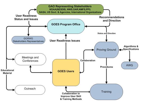 鉴于卫星平台的频繁更新和换代, 以及其探测能力对气象业务能力提升的重要性, GOES-R 试验场已经形成了一套较为成熟的新卫星准备过程(右图为 GOES-R 用户准备程序图)。