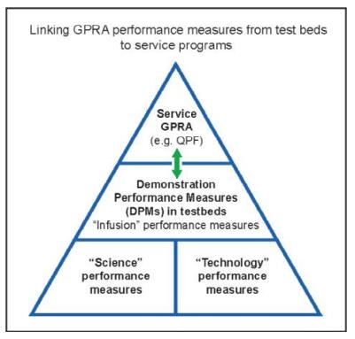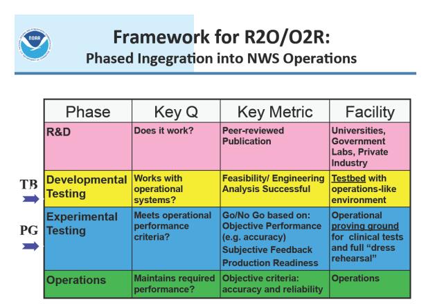 面对中试平台这样的新体制和机制,在国家对 NOAA 进行考核(GPRA 指标)的指标很难改动和新增加的情况下,如何对投入越来越多的中试平台和试验场从业人员进行考核,也是实际运行中的重要问题。 NOAA 采取了修正预报服务这一重要指标,即在 NOAA 考核体系中,预报服务的基础,包括了之前的科学和技术创新, 在这里概括了中试平台最主要的工作(右图)。考核体系的改进,也让中试平台这一最看重结果的过渡机制,能够让参与人员脚踏实地地奉献出关键智慧。同时,这样的考核机制完善,也在很大程度上落实了“需求牵引”,让更多的资源和人力,围绕和聚焦业务短板,从而让事业不断前行。