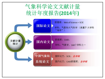 本报告从内容上看,如下图所示,从三个角度,给出2013年度气象科学论文文献计量统计结果:即国际气象和大气科学领域、国内气象学领域,以及中国气象局系统全学科领域科学论文发表情况。
