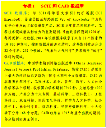 本报告基于中外文献数据库(CAJD和SCIE,专栏1)对国内外气象和大气科学领域(即SCIE中的“气象和大气科学”领域,CAJD中“气象学”领域)在2013年的论文出版物进行文献计量分析。报告还特别对中国气象局所属机构年度科技论文(两个数据库的所有领域)进行了统计和分析。