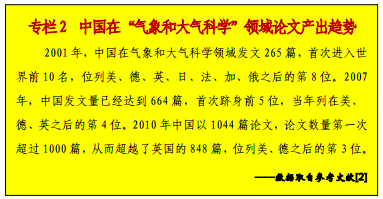 2013年,全球在“气象和大气科学”领域共发表了12436篇论文,按照发文量的国家和地区分布,中国位居第2位,保持了自21世纪初开始的论文产出力渐进的态势(专栏2)。