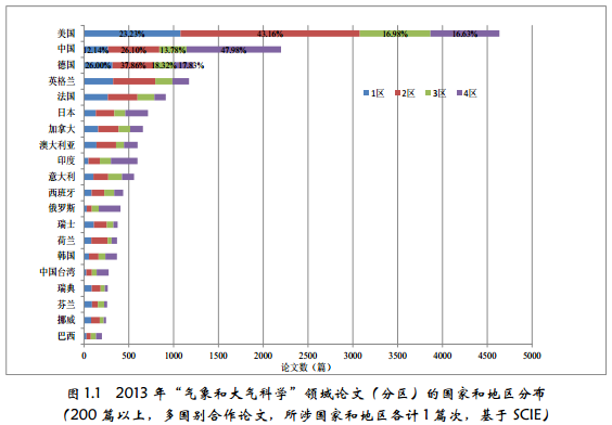 ——国家和地区分布。2013年在“气象和大气科学”领域发表的论文,按照作者所属国家和地区的分布,美国、中国和德国分别发表了4597篇、2199篇和1209篇,位列前三甲。发表论文在200篇以上的国家和地区分布,见图1.1和附录表1.1。在这些图表中,还区分了刊载各国家和地区所发论文的期刊分区(即按照期刊的影响因子从高到低分为1-4区,每个区分别覆盖25%的论文)情况。数据表明,中国在高端期刊上的发文量偏低,却有近一半的论文发表在4区期刊上。
