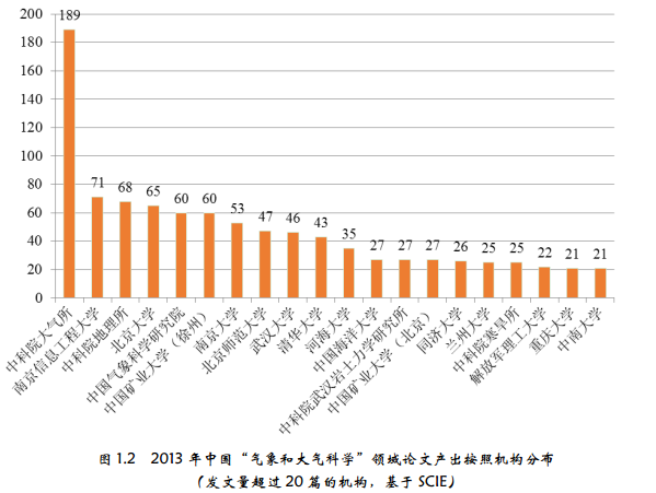 ——机构分布。2013年中国“气象和大气科学”领域SCIE论文的主要产出机构分布见图1.2。2013年发表论文数在15篇及以上的机构,见附录表1.6。中国发表气象和大气科学领域国际论文的机构分布较为广泛,其中,中科院大气所遥遥领先其他机构,以189篇位列第1位。有22家机构的发文量为20篇或更多,其中,除了中科院3个研究所(大气所、地理所和寒旱所)及中国气象局气科院之外,其他18家机构全部为高校,包括香港科技大学。这表明中科院和高校在本领域科技创新能力上占有绝对的优势。