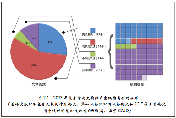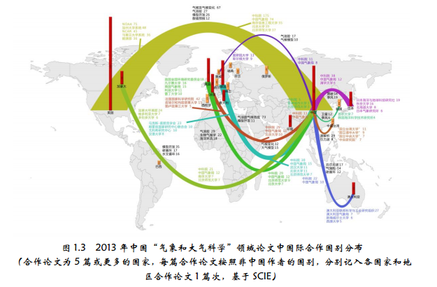 ——机构分布。2013年在“气象和大气科学”领域发表的论文,按照作者隶属的机构分布,中国科学院、NOAA、NASA、NCAR、科罗拉多大学和里丁大学分别发表了743篇、533篇、404篇、347篇330篇和191篇论文,位列论文产出机构的前6名。发表论文在100篇以上的机构分布见附录表1.2。