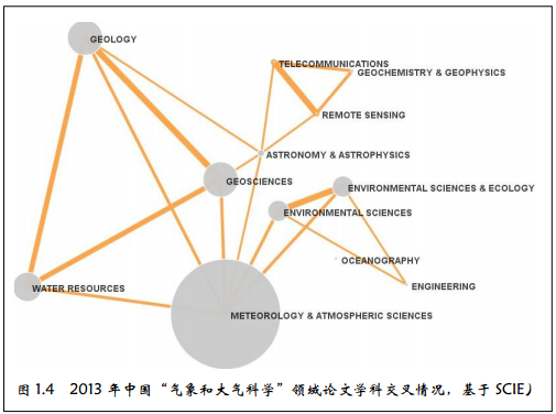 ——学科分布。2013年中国“气象和大气科学”领域SCIE论文中,与其他领域交叉的前三个学科(论文数,比例)分别是地球科学多学科(682篇,31%)、水资源(567篇,25.8%),与学科整体论文相比,除了主要交叉学科不同之外,主要交叉学科的论文比例也要高很多。图1.4给出主要交叉学科信息,更多的信息见附录表1.3。