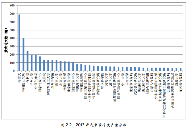 ——产出机构。有40家机构在2013年产出论文在35篇或更多(图2.2),论文产出超过百篇的机构有14家之多,其中南京信息工程大学以692篇位列榜首。从机构分布来看,中国气象局系统的多家机构,包括直属机构以及“一院八所”和部分省级气象局进入榜单,表明气象部门气象科技创新能力的全面提高之趋势。产出机构的详细信息,请见附录表2.2。