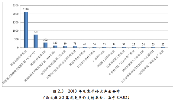 ——基金资助。在2013年发表的气象学论文中,得到国家自然科学基金资助的论文最多,超过了2000篇,达到2110篇。图2.3给出发文量在20篇或更多的基金分布,详细信息见附录表2.3。