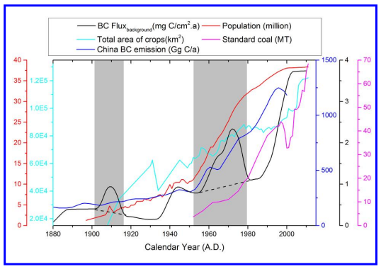 Nature集团2014年7月在网上Scientific Reports刊发中国科学院湿地和环境重点实验室学者与合作者的文章(doi:10.1038/srep05723),重建了我国三江平原大气气溶胶的主要成员、也可能是气候变化第二驱动的黑炭(BC)最近150年的演化。图中给出了该地区1850-2010年间BC背景通量变化(黑线),以及黑龙江省的人口(百万,红线)、农作物总面积(km2)、煤耗(百万吨标煤,品红线),图中还给出中国BC排放量(GgC/a,蓝线)。(来源:Scientific Reports)