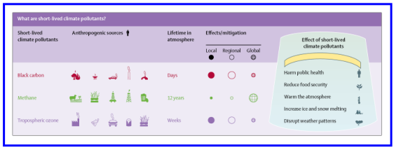 由《柳叶刀》杂志指定的一个气候健康委员会最新发表的一份报告认为,二氧化碳的减排还应辅助以减少短期气候污染,后者有很强的全球变暖效应,但在大气中存在时间相对较短。减少这些污染会在近期起到更大的抑制全球变暖效果,不仅如此,污染带来的不利于健康的作用也能改善。(来源:Lancet)