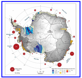 北京师范大学全球变化与地球系统科学研究院的学者与来自芬兰、瑞典等国家的学者合作,揭示了在全球变暖背景下,海洋驱动南极冰架变薄,并由此加剧冰架的崩解和退缩机制,表明海洋对南极冰架的崩解起着关键作用。图中给出环绕南极的 5 个海区的 26 个海域因冰架崩解带来的冰体损失(红色圆)。这项研究成果发表于美国《国家科学院院刊》(PNAS)。(