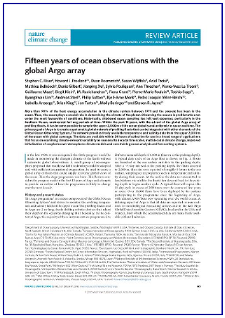在全球海洋Argo项目实施15年之际,2016年1月27日,《Nature-气候变化》杂志在线发表了关于该项目的评述文章——“全球Argo海洋观测十五年”。这篇由美国华盛顿大学学者牵头,来自18个国家的27位作者共同署名的文章,全面回顾了国际Argo计划实施15年来取得的成果,并展望了未来Argo海洋观测及其资料应用的广阔前景。中国气象局图书馆郑秋红、田晓阳对文章全文进行了翻译。