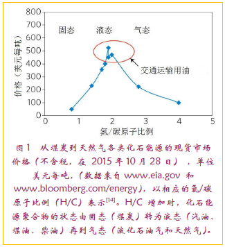 图1展示了美国化石原材料和产品现货价格相对燃料原子的比例。交通运输业更倾向于使用液态燃料。因其自然属性,富碳的燃料为固态,富氢的为气态。当氢/碳比例接近2,环境条件适宜时,出现液体。这种液体能量密度比乙醇高50%,是20MPa压缩天然气的五倍。液体比气体易于处理得多,这种便利性不可小觑,在市场价中有所体现[14]。