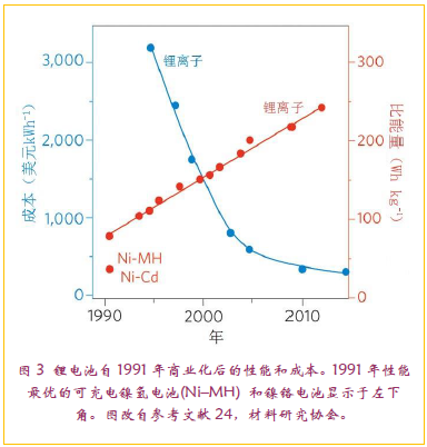 锂电池能满足这些需求吗?锂电池的性能提升和成本降低趋势一直相当不错(图3)。1991年面世时,锂电池的能量密度比当时最好的镍氢电池、镍镉电池高两倍。通过此后的发展,性能高了倍,而价格相对低了十倍。但锂电池的进一步发展受其性质限制:锂离子的单次充电量,嵌入阳极和阴极的存储量,以及电解质液体的可操作电压。
