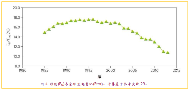 在新兴国家是另一幅图景,能源需求太大,每一种发电方式都在增长。其中两个人口大国——中国和印度,不仅对核能有雄心壮志,对任何一种能源都如此。2014年中国上线了5.3GW核电,20.3GW风电,21.8GW水电以及53.3GW火电(煤炭为主)。而2014年9月至次年同期间,印度也投产了一个1GW的核反应堆,产了16GW的煤电,风能和太阳能总共产了5GW。这两个国家及其他一些国家近几年非水电可再生发电的量都超过了核能[25]。简而言之,这些国家一切通吃。导致核能的总产量虽然在增高,但所占比例将会继续减少(图4)。虽然现在成本还让位于需求,但长期来看,发展中国家遇到的经济力量也会限制核能在发展中国家的发展。