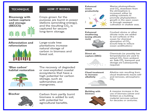 中方法:碳捕捉和存储生物能源法、植树和再造林法、“蓝色碳”栖息地恢复法、生物碳法、海洋生产力增强法、强化天气法(利用硅酸盐石)、直接空气捕捉法、云处理增碱性法和生物质建筑法。(
