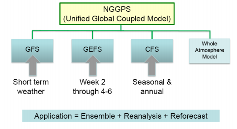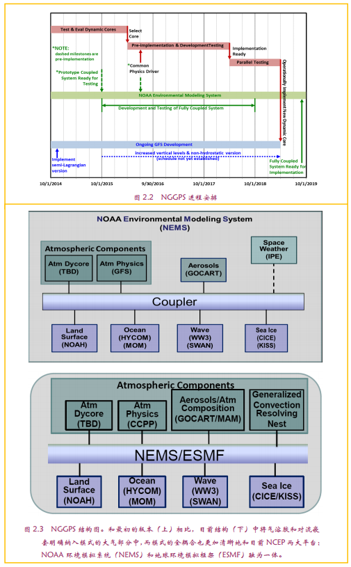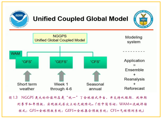NGGPS模式的定位,在于其“统一”功能:即将成为5年后美国气象部门支撑所有预报产品的全球耦合模式(图1.3)。其应用按照时间域跨越了短期天气、延伸期(1周到4-6周)和季节及年预报的几乎所有天气气候预报产品的时段。一旦NGGPS如期和保证质量地完成,其业务应用受益时间,预期将从2020年开始持续数十年。
