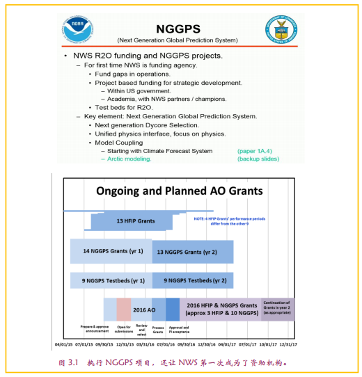伴随NGGPS的开发,至少在初期NWS将通过基金(NWS R2O项目)资助的方式资助来自美国大学、联邦机构和实验室的团队参与其中(图3.1)从根本上说,这一不同于以往的机制创新,源于美国国会批准的相关资助项目的机制。美国管理层更多地基于公众和政府角度,推进R2O的立项和放大这一机制,或许未来NWS还要更多扮演这一角色,从而将美国乃至全球更多创新成果在业务端发挥作用。