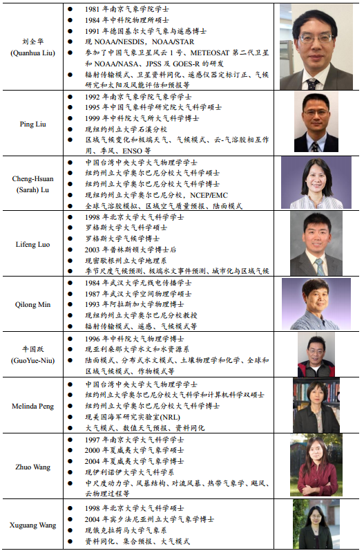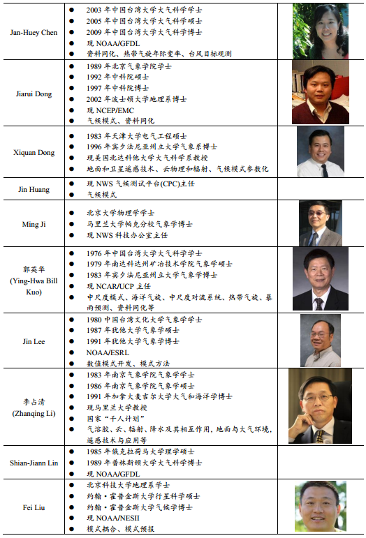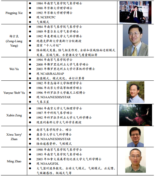 美国仍然是我国出国留学人员最主要的目的国,其在大气科学等科技领域的总体优势依旧明显,对世界各地的科研人员具有显著的吸引力。参与NPPGS开发的学者们大多都遵循着“本科中国—博士海外”的发展模式,均有在国内成长和求学的经历,在美国等发达国家高校继续深造后,取得硕士或博士学位,现在在美国高校、科研机构等任职。表中30位学者,学习背景中和南信大(9人)、中国台湾的大学(6人)、北京大学(3人)、南京大学(2人)等气象专业较强高校有关系的占较大比例。海外华人科学家学术起点高,了解国际学术界的最新动态,无疑将是我国气象科技发展重要的借助力量来源。
