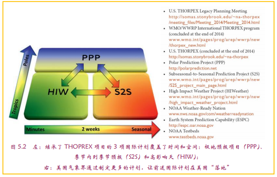 虽然NGGPS的起步,有桑迪飓风和国会质疑NWS能力及随后拨款支持动作这一看似偶然要素在其中起作用,但实际上,美国气象界在2014年THORPEX结束后,很快结合后续的三大国际计划(PPP、S2S和HIW,图5.2)对接了THORPEX,并通过多种计划和平台建设,让这些计划很快在美国“落地”。尤其是,NOAA强化其试验平台和提出“天气有序”理念等,为NGGPS的横空出世打下了很好的伏笔。