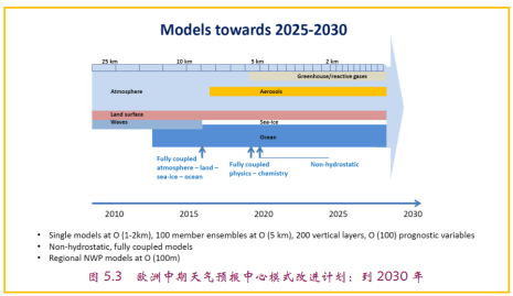 如果说到2015年世界上主要天气气候预报中心预报准确性排名的竞争,以欧洲中期天气预报中心(EC)完美胜出的话,那么今后EC模式领先的格局是否会改变,悬念也许要等到2019年前后,要看NGGPS作为后来者的表现。当然,美国气象界在努力开发NGGPS的时候,EC也不会停顿,但其未来20年左右模式发展的路子,基本上还是过去开发的延续:提高时空分辨率和尽可能多地耦合相关过程(图5.3),换句话说模式的更新仅仅是延续性的,而非如NGGPS有丢掉过去的革命性改进。在NGGPS存在风险但有更多期待时,EC模式的下一步发展其实还具有未知要素:EC至今尚未公布2015年以后时间段的发展规划,这一不太正常的情况,也许意味着欧洲也在策划另一个模式颠覆性开发的方案。尤其是,EC周围的科学家近年来多次提及的随机动力学过程及其在未来模式开发中的潜力研究成果,是否能在3-5年完成模式研制和走向准业务化,从而实现模式开发战略思路的转折,或许是EC目前尚没有明确未来方向考虑的原因之一。