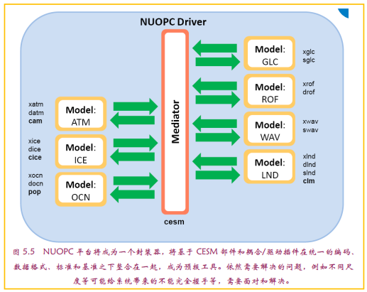 NGGPS的研发,NWS不仅高调而且在战略上提出了该模式是作为“统一”的模式,即2020年前后该模式将是NCEP业务模式之核心。NGGPS意义上的统一,一是在预报期限上的统一:从短期直到季节乃至年预报统统包含;二是在预报要素上的统一:飓风、降水和旱情等各种要素预报均可来自该模式结果。然而更深层次上的统一也许更重要:美国学术界(大学和企业等)的预报模式编码有可能在NGGPS的大旗下走向“统一”:模式的网格、框架、地形和编程规则等基本要素的统一,以及模式中各种耦合和涉及大气层以外圈层表示方法等的统一。如果后面的统一顺利实现,其影响可能是巨大的。首先,未来“插件”式的模式有可能被铸造:即在模式技术层面上有了统一规则和基准或标准后,一个新模式的诞生,可能是各方最优秀的过程处理“模式插件”的组合而已,即世界上最好的模式,也许是实验室A的大气核心+实验室B的海洋耦合+……;这些“插件”组合在一起,进行调制后即可应用,并最终形成美国整体预报能力平台——NUOPC(图5.5)。这样基于同样的技术平台框架的开发范式,一旦成功,其影响无疑在国际上会具有示范意义,美国业务机构和学术界就此制定相关的国际标准和规范,进而建成和完善也许是国际上唯一已经形成共识的开发平台,可能就是顺理成章的事情了。在进入21世纪第二个20年之际,或许是气象界从气象耦合模式向地球系统模式过渡的重要时期,美国NGGPS起到这样的“带头”作用显然是最“划算”的。