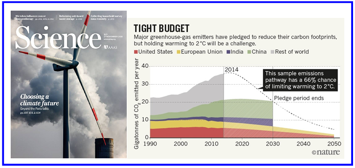 在巴黎气候大会开幕前出版的Science杂志(左),以传统能源和新能源对比的画面,推出本期的主题专栏——选择气候未来。这是参加出席巴黎气候大会人员面临的选择,更是地球人必须面对的:图中位于德国莱茵河畔威斯特法伦地区的燃煤电厂与风力发电风车近在咫尺,我们的选择会让地球气候的未来相差万里。巴黎气候大会后,Nature杂志用全球碳排放项目的数据(右),进一步说明了承诺排放和实现限制升温在2℃之内的目标之间的挑战。(来源:Science/Nature)