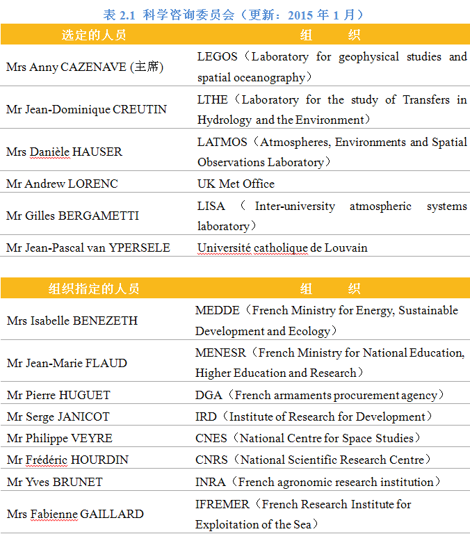 法国气象局行政总部设有战略、秘书处、质量管理、人力资源和联络5个职能部门。其下属机构包括区域中心、技术、产品、教育培训、科研和商业。其中,理事会、战略、秘书处、人力资源、商业、联络、科研、培训属于管理分支,观测及信息技术、气候及天气预报属于技术分支。此外,表2.1给出了法国气象局科学咨询委员会的名单。