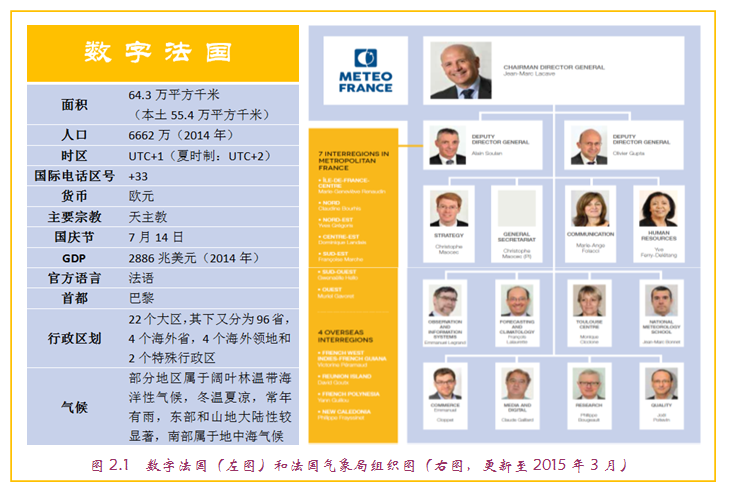 行政体制与机构设置:法国气象局管理层人员的任命和财政预算均由交通部负责。气象局的最高行政长官是首席执行官,下设理事会,理事会的组成为国家代表和气象局内部管理人员,气象局的内部事务由理事会成员讨论并作出决定。法国气象局设有1位局长(Jean-Marc Lacave, 首席执行官)、2位副局长(Alain Soulan、Olivier Gupta分别负责发展和区域事务、公共和国际事务),如图2.1右所示。