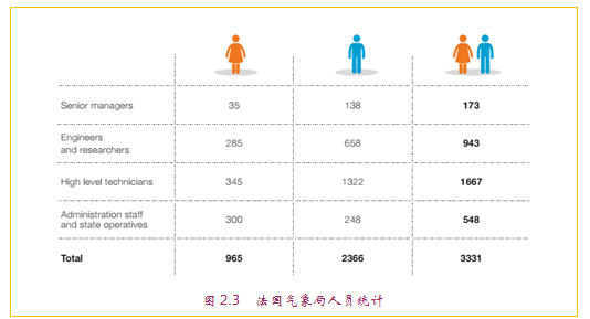 法国气象局行政总部设在巴黎的Saint-Mandé。国家气象业务中心设在图卢兹,聚集了所有重要的业务技术部门、国家气象研究中心(科研)和国家气象学校(培训),目前有超过1200名员工在这里工作。法国气象局共有员工3331名(2015年数据,见图2.3),80%以上的雇员为工程技术人员和科研人员,其教育水平在硕士与博士之间。