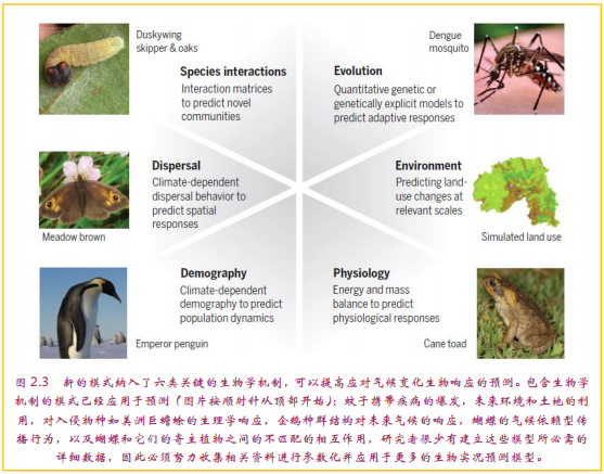 随着全球气候变化加速,对于生物学家来说未来几十年最迫切的任务之一是研发对生物响应的准确预测,以此来指导有效保护生物多样性。生物学中的预测模型使得科学家可以保护物种和生态系统以应对例如气候变化扰动产生的变化。然而目前的预测模型并没有包含重要的生物机制,例如人口、扩散、进化和物种的相互作用等。这些生物机制在调节过去和现在的气候变化响应中已经显示出了重要作用。然而,目前模型的预测并不足够准确。尽管涉及相当多的复杂因素,生物学家们正迅速对提高预测准确性的关键生物过程展开研究。研发这些现实模型时面临的最大障碍是所需的复杂数据几乎总是缺失。这份研究报告提供了弥补模式复杂性和信息之间逐渐扩大的鸿沟的方法,从而预测和阻止气候变化对地球上生物造成的绝大部分破坏。