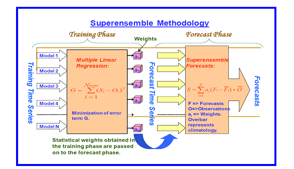 美国佛罗里达州大学学者在最新发表的评述多模式天气、季节气候和飓风超集合预报论文中,用图解释了多模式超集合方法。该方法通过“培训”和“预报”两个阶段,先在第一阶段用统计方法获得不同模式的权重,之后进入预报阶段实施超集合预报。而不同模式的权重是随时间变化的,保证了超集合预报在整体上得到最好的结果。(来源:Reviews of Geophysics)
