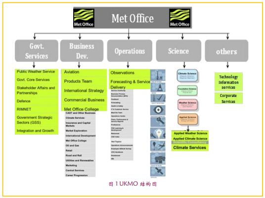 图1是英国气象局(UKMO,链接1)的总体结构示意图,主要有政府服务部、业务发展部、观测运行部、科学部和其他部门(信息、人力等)组成。UKMO在组织结构上像商业公司,有董事会,董事长、董事、首席执行官、财务总监等,MetOffice董事会的首要职责是发展该机构的长期战略。董事会非执行董事鼓励帮助筹集MetOffice的外部意识以及他们的工作,并且建立良好的外部关系。执行委员会的工作是领导、指导和管理MetOffice,从而确保成功的目的、目标和业务流程管理系统。他的职责不但是领导和管理MetOffice,而且还有指导战略改变和执行董事会制定的战略决定。执行委员会进行关键沟通,并且制定投资决定。执行委员会成员在委员会主任的领导下工作。MetOffice科学项目管理团队由科学主任(首席科学家)、3个副主任和2个项目负责人组成。