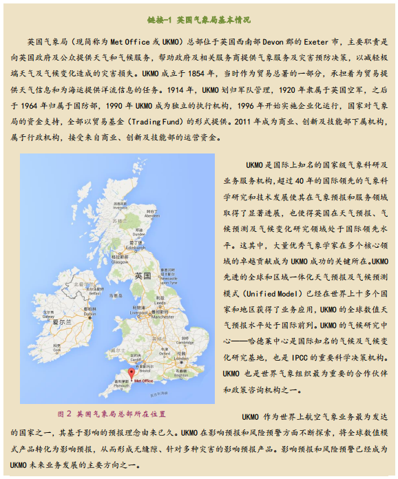 未来五年,UKMO主要的科研及业务服务目标主要聚焦在:(1)为预防极端天气灾害造成的生命及财产损失服务;(2)为更具有适应力的英国做出贡献,提供好的天气和气候服务;(3)帮助政府及商业公司在对未来进行规划及投资时做出明智选择;(4)帮助政府制定应对气候变化所导致风险的策略;(5)通过较好地使用天气及气候信息去支持经济发展。
