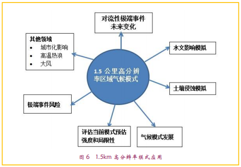 与此同时,MOHC也注重应用该高分辨率区域气候模式的开发,发展了convective-permitting高分辨率区域气候模式,模式的分辨率达到1.5km。应用该高分辨率区域气候模式,已经开展包括如高温热浪和暴雨等极端事件的未来变化,城市效应,水文影响模拟、土壤侵蚀模拟等方面的诸多科研和业务工作(图6)。下一步计划将利用这个高分辨率区域气候模式,研究其对东亚气候的模拟能力,以及模式分辨率和对流参数化方案对东亚气候模拟性能的影响,主要聚焦于日尺度内极端高影响事件(如梅雨锋、热带气旋、暴雨、热浪)和城市效应的模拟,并开展未来气候变化(包括极端事件变化)的预估与影响评估工作。