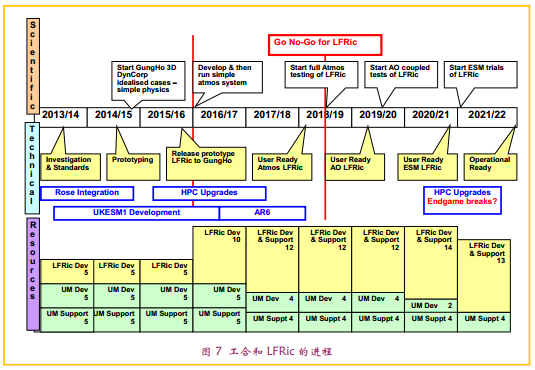 针对下一代数值预报模式发展,UKMO的业务预报模式刚刚实现ENDGame的业务化,这也是英国一体化最新的一次大规模更新。ENDGame是一个经纬网格的格点动力框架,经历了10年左右的研发和改进,目前已确认的优势有:改进的台风和温带气旋强度;改进的热带波动和MJO;改进的重力波描述;改进的飞行巡航高度上的风场预报;改进的表面天气要素预报等。该模式将作为业务模式运行十年左右,直到2025年。针对2025年之后的下一代模式,UKMO最主要的考虑是要应对未来更大规模的并行计算以解决模式计算效率问题,将新一代动力框架的研发计划—GUNGHO分为两个阶段:2011-2013两年的研究阶段;2013-2016三年的开发阶段。其目标是要求新的动力核在科学上具备与ENDGame相当的模拟性能,但具备更好的可扩展性以应对未来更大规模的并行计算。目前最新进展是已初步确定将采用有限元方法和准均匀网格。2016年之后的计划命名为LFRic,主要工作是在新的工合动力框架上加入物理过程,使之成为一个完整的大气模式,预计在2019年得到初始版本,2022年开始进行业务化准备,最后替换ENDGame。未来10年内,融入工合理念的LFRic”模式将完成换代(图7)。