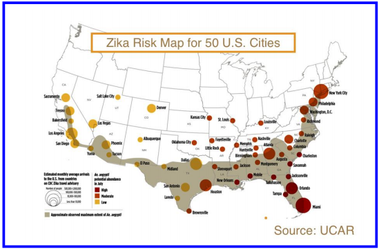 无论是寨卡还是登革热和基孔肯雅热,这三种在全球传播的病毒有很多共同的地方:例如,都是通过埃及伊蚊传播,而且最近全都在美国出现过。美国NCAR的科学家通过公开科学讲座告诉公众:气候因子可以影响埃及伊蚊的发育、繁殖和生存,还能调节蚊体中病毒的孵化和再生,从而构造了病毒传播多种途径。科学家还给出美国全国50座城市寨卡风险分布,提醒公众注意预防。(来源:UCAR)