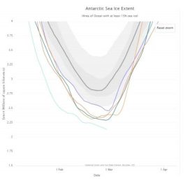 ——1979年以来南极海冰范围的记录已经持续了38年,2017年2月底出现最低值:2月28日213.1万平方千米,这比之前的最低值,1997年2月27日出现的229万平方千米减少了15.9万平方千米,几乎相当于弗罗里达州的面积。获取南极海冰数据的美国国家冰雪数据中心主任Mark Serreze对今年南极海冰面积极小值的出现作出上述评价。
