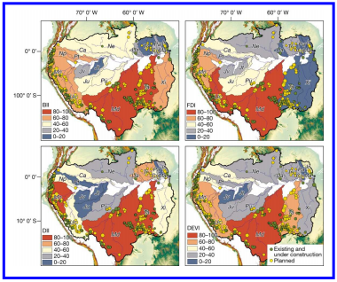 多国学者合作开展的针对亚马孙河流域水利设施的综合研究中,用多种指数研究了已有和计划建设的大坝对子流域脆弱性的分析。这些指数报告:BII(流域完整性指数)、FDI(河流动力指数)、DII(大坝影响指数)和综合指数DEVI(大坝环境脆弱性指数)。(来源:Nature)